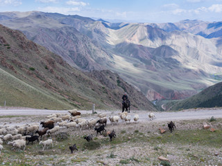 De nombreux lacets plus tard, nous sommes au sommet d’un nouveau col. D’un côté, la route sinueuse que nous venons de parcourir, de l’autre, la descente en pente douce vers Song Kul. Sous un ciel versatile - entre gouttes de pluie et éclaircies – nous découvrons le lac. Les conifères du versant précédent laissent place à une plaine nue de végétation et parsemée de yourtes. Nous prolongeons notre bonhomme de chemin jusqu’au deuxième col ceinturant le lac. Nouvelle série de courbes à 180 degrés - en descente cette fois - durant laquelle un homme sur un cheval impressionnant menant son troupeau vient échanger quelques mots. Partage éphémère mais plaisant. Plus bas, au bord d’une rivière, un chameau d’une beauté étonnante nous fait de l’œil, et nous convainc que c’est ici que nous passerons la nuit. Il est encore tôt mais, n’étant pas pressés de rejoindre l’axe principal, nous nous accordons une nuit supplémentaire dans ce paysage de carte postale. Le lendemain, Bonnie décide à nouveau de faire la capricieuse. Il faut pousser. A 3 000 m, nous retrouvons cette impression qu’on nous râpe l’intérieur des poumons à chaque effort. Nous finissons par rejoindre la route principale. Les premiers kilomètres sont époustouflants. Le bitume, à l’instar de la température ambiante, est parfait. Nous glissons sur des courbes idéales au sein d’une espèce de canyon longeant un cours d’eau peuplé de nomades. L’un de ces moments hors du temps où nous réalisons pleinement ce que l’on est en train d’accomplir et la chance que nous avons. C’est avec ce sentiment que nous rejoignons Bichkek.